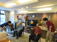 花見が終わり、本日の15時のおやつは、桜茶と桜色のおやつをご用意させて頂きました。いつもと違う、おやつで、普段は、あまり食の進まないご入居者様にも、食形態を落とさず、常食でゆっくりと召し上がって頂ける物をご用意させて頂きました。見た目もかわいく、桜茶の香りもあり、皆様完食されました。喜んで頂けて良かったです。