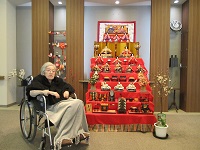 入居者様が、1階の雛人形を鑑賞に来てくださいましたので、写真を撮らせて頂きました。昔と違って段飾りを飾る方も少なくなり、毎年、立派ねぇと感心してくださいます。