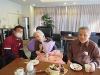 本日、ご夫婦でご入居をされているB様のお誕生日でした。お誕生日のご希望は、奥様の体調不良により、延期となっております結婚記念日のお祝いの為のスライド写真の上映会でした。1階ラウンジで、テレビの正面にお座り頂き、ケーキとロウソクとお花を飾らせて頂きました。鑑賞の後に、ケーキカットを