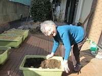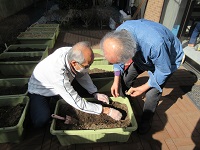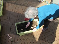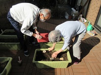 ジャガイモの種付け第2弾を本日、行いました。昨日迄の暖かい日と違い、風かやや冷たく感じる気温でしたので、ウッドデッキでゆっくりくつろぎながらではなく、種付けに全集中して行って下さいました。(笑)