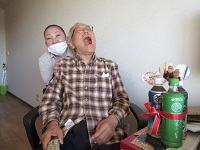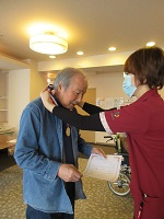 本日、1月10日は、S様の誕生日です。誕生日の希望は、お寿司を食べに行きたいとの事でしたが、コロナ禍の緊急事態宣言であり、感染予防から、お寿司を食べに行く事は、延期して頂きました。いつも、施設の自動販売機で、お茶のペットボトルを購入されておりますので、スタッフと一緒に撮影した写真とともに、お茶をプレゼントさせて頂きました。プレゼントをお渡しした時、いつも見せる照れ屋な表情をされ、ふざけた笑顔での写真となっております。