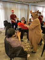 15日に、1階ラウンジにて生ライブの中継のライブ鑑賞がありました。今回は、サンタの衣装で演奏して頂き、入居者様と蜜を避けて楽しませて頂きました。入居者O様から次回、「星影のワルツ」を聞きたいとの要望もありました。来月の演奏を楽しみしております。演奏会ありがとうございます。