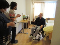本日、O様のお誕生日でした。ご本人の希望で、恥ずかしので、こっそりと祝ってほしいとのご希望があり、こっそり?大きな声でバースディソングを歌いながら居室にお邪魔しました。