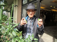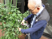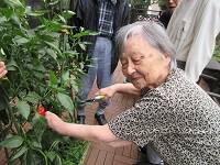 ピーマンが実が沢山付きましたので、本日、園芸サークルの活動で、ピーマンの収穫を行いました。1つだけ赤いピーマンが出来ましたので、女性の参加者のO様に収穫をお願いしました。