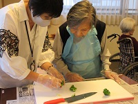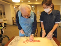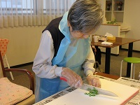 ご入居者様とスタッフで、野菜の下準備を一緒に行っていましたが、途中からは、ご入居者様だけで行ってくださいました。