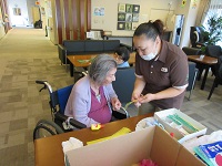 先日、コスモスのお花の飾りを家庭・文化サークルのご入居者様と一緒に1階ラウンジで作品作りを行いました。皆様、3密を避けて頑張ってます。