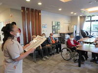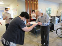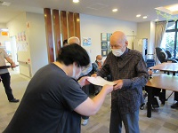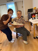 日頃の感謝を込めて、スタッフから入居者様にお手製のカバンをプレゼントをしました。最近は、あまり開眼される事が少なくなってきたB様もこの時は、笑顔を見せてくださいました。