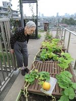 コロナ対策で、外出も制限しておりますので、屋上、川口ファームと緑を求め、Y様とともに散歩をして気分転換を図って頂きました。朝顔の鉢植えは、園芸部長の畠中氏の力作で、まるで、朝顔市で購入したような出来栄えです。