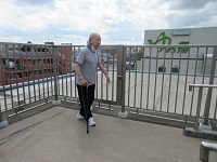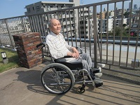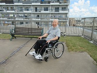 リハビリ室や廊下では傾斜の訓練はできないので、屋上で、歩行訓練を行いました。酷暑で暑い中、でも、外気での訓練は、楽しかったようです。素敵な笑顔でした。