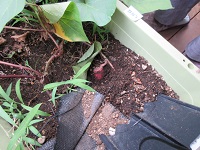 さつまいもの収穫は、10月から11月にかけて行うらしいですが、この時期は、どのように成長しているのか、興味があり、O様と一緒にさつまいもを少し土を退かして観察しましたら、秋の収穫が楽しみな芋を発見しました。