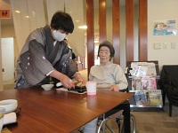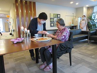 いつもと違う雰囲気の中、いつもは介助で召し上がられるご入居者様も頑張ってご自身で召し上がられてました。