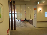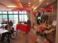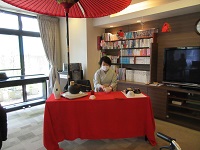 1階のラウンジに、麻の暖簾を入り口に垂らし、お花のアレンジと和服の職員のお出迎え、ラウンジ奥には、和傘を立て、抹茶のお茶たての場を配置。