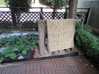 先日、壁に川口ガーデンの看板を作りましたが、あいにくの雨で、看板が落ちてしまったので、今回は、支柱をかけてリニューアルです。雨にも負けずアピールしてます。原木しいたけも日よけを設置しました。みんな頑張ってね!!