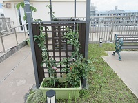 ウッドデッキの野菜の見学に、S様が来てくださいました。さつまいもの苗が何枚もの葉に囲まれていて、大きくなっていた事に、「しばらく見ないうちに大きくなったなぁ」と話され、野菜と一緒に写真を撮りますとの声掛けに思わず、カメラに顔を向けてくださいました。