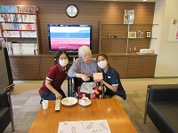 6月2日にお誕生日を迎えられたK様のお誕生日イベントのご紹介をさせて頂きます。K様のご希望にてショートケーキをご用意させて頂きました。お好きな食事をお伺いしましたら、ケーキが食べたいとの事でしたので、イチゴのショートケーキのホールにろうそくを17本立てて、ハッピーバースデーの曲の合唱の後、頑張って吹き消して頂きました。17本のろうそくを消すのは、大変そうでしたが、全てお一人で行って頂きました。その後、プレゼントをお渡ししました。甘い物が大好きなK様、ケーキもしっかりと完食されました。来年はどのケーキにしましょうか?(*^_^*)