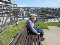 青空で、湿度も昨日より、低く、気温もさほど高くなかったので、屋上で順番に日光浴を行いました。やはり、適温での室内よりも、外気は気持ちが良いです。2割増し?3割増し?の笑顔の写真が取れました。日差しが強い為、どうしても下向きの写真になってしまいました・・・