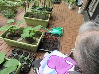 H様が廊下を車いすで自操されておりましたので、本日は、天気も良かった為、一緒にお誘いし野菜の苗を見に行きました。野菜も大きくなって、かぼちゃの葉の大きさにびっくりしてました。