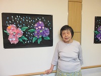 入居者様が1階に展示している藤の紫陽花がきれいと話されておりましたので、作品の前で写真撮影をさせて頂きました。いつも、頑張って作品作りをして下さる内山リーダーとご入居者様、ありがとうございます。
