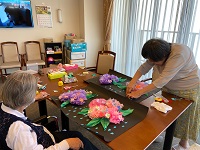 紫陽花を作成して下さっておりましたが、今回は、模造紙に張り付ける作業を行って頂きました。完成した作品を、4階エレベーター前に展示させて頂いております。