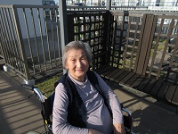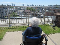 いつも、穏やかな雰囲気のM様を屋上にご招待!一人で、エレベーターに乗られ1階のラウンジも含め、車いすを自在に扱い移動されておられますが、屋上は、危険リスクが高い為、外へのドアは施錠されているので、お一人では、難しいので、屋上に出た瞬間に「気持ちがいいわ」と喜んで頂け良かったです。