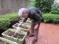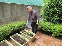 本日、さつまいもの水やりは、Y様に担当して頂きました。私の植えたのはどれと探され、プランターの名前を確認しながら丁寧に水やりをしてくださいました。明日は、別の方が担当となります。雨でしたら、水やりは、お休みです。