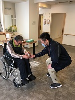 今月、入院を予定されているご家族が、入院前にお父様にお会いしたいとのお話があり、新型コロナ対策で、面会を中止させて頂いていますので、玄関のガラス越しでの面会となりました。入居者様には、事前にお話をさせて頂いておりました。ご家族様に急な予定が入り、1時間程、遅れての到着でした。それまで、笑顔でラウンジで過ごされておりましたが、やや眠くなられたのか、ご家族との面会では、下向きの顔になってしまいましたが、笑顔の時に写真を撮影してホームページに載せてくださいとのお話があったら、偶然にも笑顔の写真をその場で撮影できました。