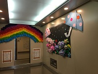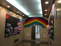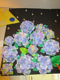 施設内に職員が作成した折り紙のアジサイが傘やカエルやカタツムリと共に1階の廊下とエレベーターに飾られています。