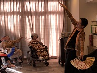 先生が13時頃施設に来ていただき、衣装に着替えている間に、ご入居者様が続々と1階ラウンジに集まり、自分で車いすを動かして来てくださる方や歩いて来られる方、介助させて頂きスタッフと一緒に来られる方、総勢35名の方々に集まって頂き、皆様それぞれに扇を手にして先生を踊りを見てしっかりと演技をしてくださいました。