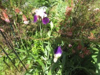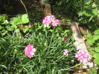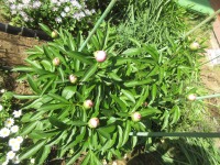 中庭の芍薬にピンク色のハマカンザシと菖蒲