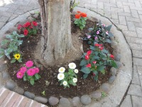 エントランス前の花壇には沢山の花を咲かせる向日葵