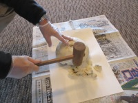 木槌を使い鏡開きを行いましたが固い鏡餅なかなか