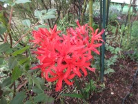 中庭にコキアが赤く色付き、ネリネの赤い花も