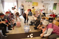 スタッフが引っ張る籠を移動しながら籠の中に玉を