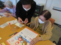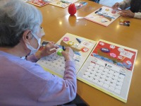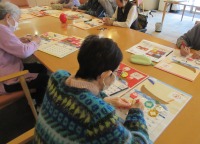 あらかじめ用意していただいたカレンダーに折り紙などを使用してマジックでイラストを描いたりダルマの形を作ってお好きなお顔を描いたりしてカレンダーの七福神に張り付けていきました。それぞれ個性的なカレンダーが完成です。皆様お部屋に飾ろうと喜んでおりました。