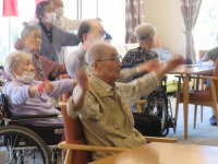 入居者様元気よく体操参加され過ごされて