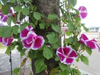 記念樹に絡ませた、朝顔のつる