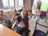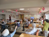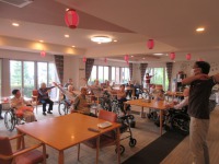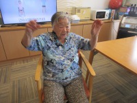 リハビリスタッフの声掛けで元気よく体操を
