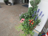 玄関両サイドには寄せ植え可愛らしく