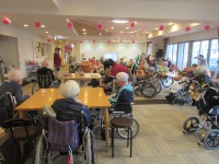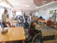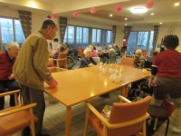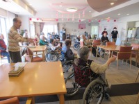 入居者様は暖かいラウンジで体操参加され