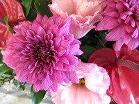 綺麗な赤のディスバッド、紫色のアンスリウムが