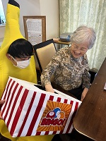 バナナの着ぐるみを着たスタッフが箱を持って、走ってお届けしています!