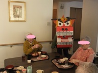 お正月には、ラウンジに集まった入居者様のところへ