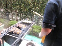 1階ラウンジの横にある庭で、炭を使ってうなぎを焼き