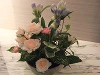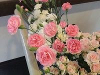 濃いピンク、白や薄いピンクのバラやカーネーションが