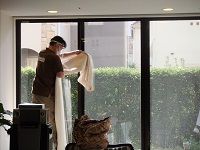 明るい陽射しが入るラウンジで、髪をきれいにしてもらうのは