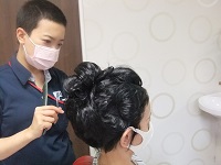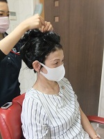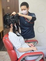 理美容室の椅子を借りて、スタッフが何やら髪の毛を