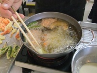 皆様の目の前で、さくさくの天ぷらが揚がり