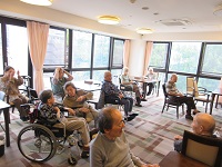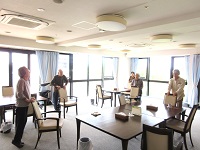 各階ラウンジや居室など、お好きなところで自由に体操をしていただいています。