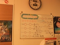 ホワイトボードに書かれた四文字熟語のクイズを考えながら