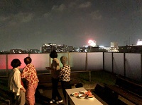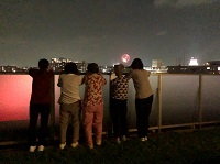 夜風に吹かれながら大空に打ち上げられる花火をみて